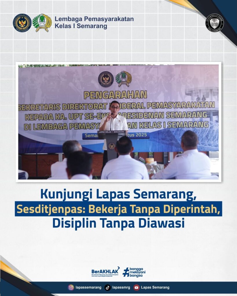 Semarang – Sekretaris Direktorat Jenderal Pemasyarakatan (Sesditjenpas), Gun Gun Gunawan, melakukan kunjungan ke Lapas Kelas I Semarang pada Sabtu (02/08). Kegiatan ini turut dihadiri oleh Kepala Kantor Wilayah Ditjenpas Jawa Tengah serta para Kepala UPT eks-Karesidenan Semarang.