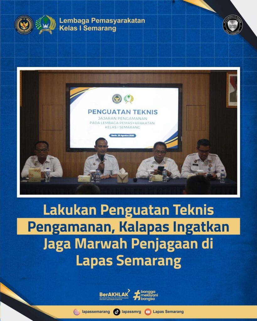 SEMARANG, INFO_PAS – Lembaga Pemasyarakatan (Lapas) Kelas I Semarang melaksanakan kegiatan Penguatan Teknis bagi Jajaran Pengamanan di Aula Merdeka pada Senin (26/08). Acara yang dimulai pukul 15.30 WIB ini dipimpin langsung oleh Kepala Lapas Kelas I Semarang, Fonika Affandi, serta diikuti oleh seluruh anggota regu pengamanan.