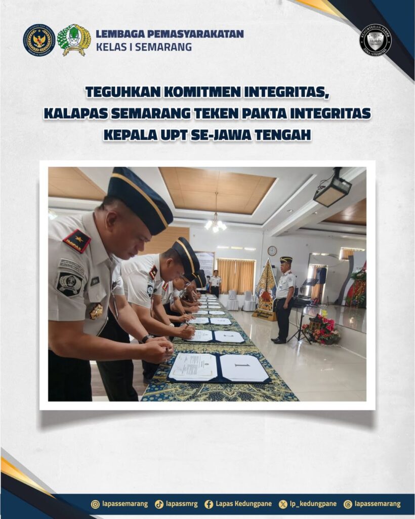Melalui penandatanganan Pakta Integritas ini, Lapas Kelas I Semarang bersama seluruh UPT Pemasyarakatan di Jawa Tengah berkomitmen memperkuat tata kelola organisasi yang bersih, akuntabel, serta berorientasi pada pelayanan publik yang berkualitas.
