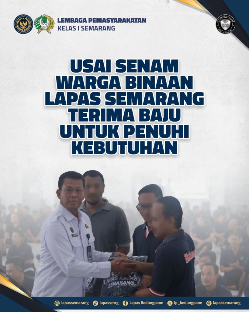 Kalapas Semarang, Ahmad Tohari memberikan pakaian kepada warga binaan secara simbolis, Rabu (28/01). Penyerahan dilakukan seusai kegiatan senam pagi di Aula Graha Pancasila.